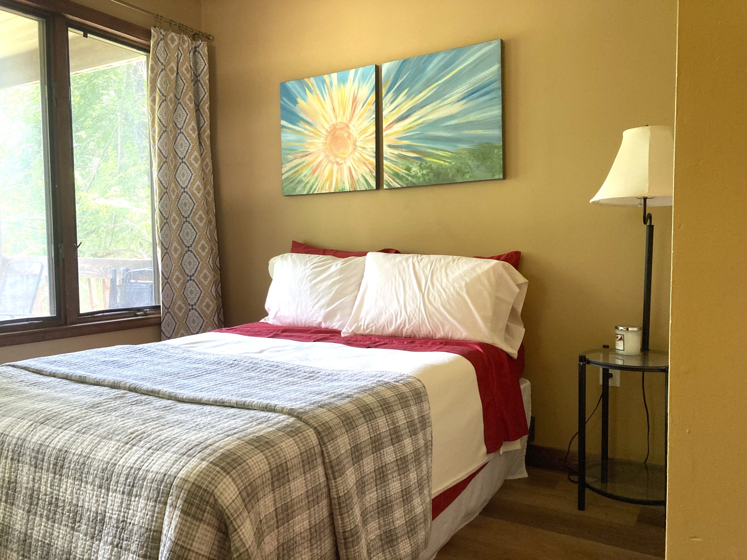 You can truly unwind in our hilltop cabins backed by acres of lush woods. You’ll find open meadows in front of the cabins where you can see deer cross in the morning and evening, have a bonfire in our large fire pit, or just enjoy the view from your deck looking out over the sunny hillside.