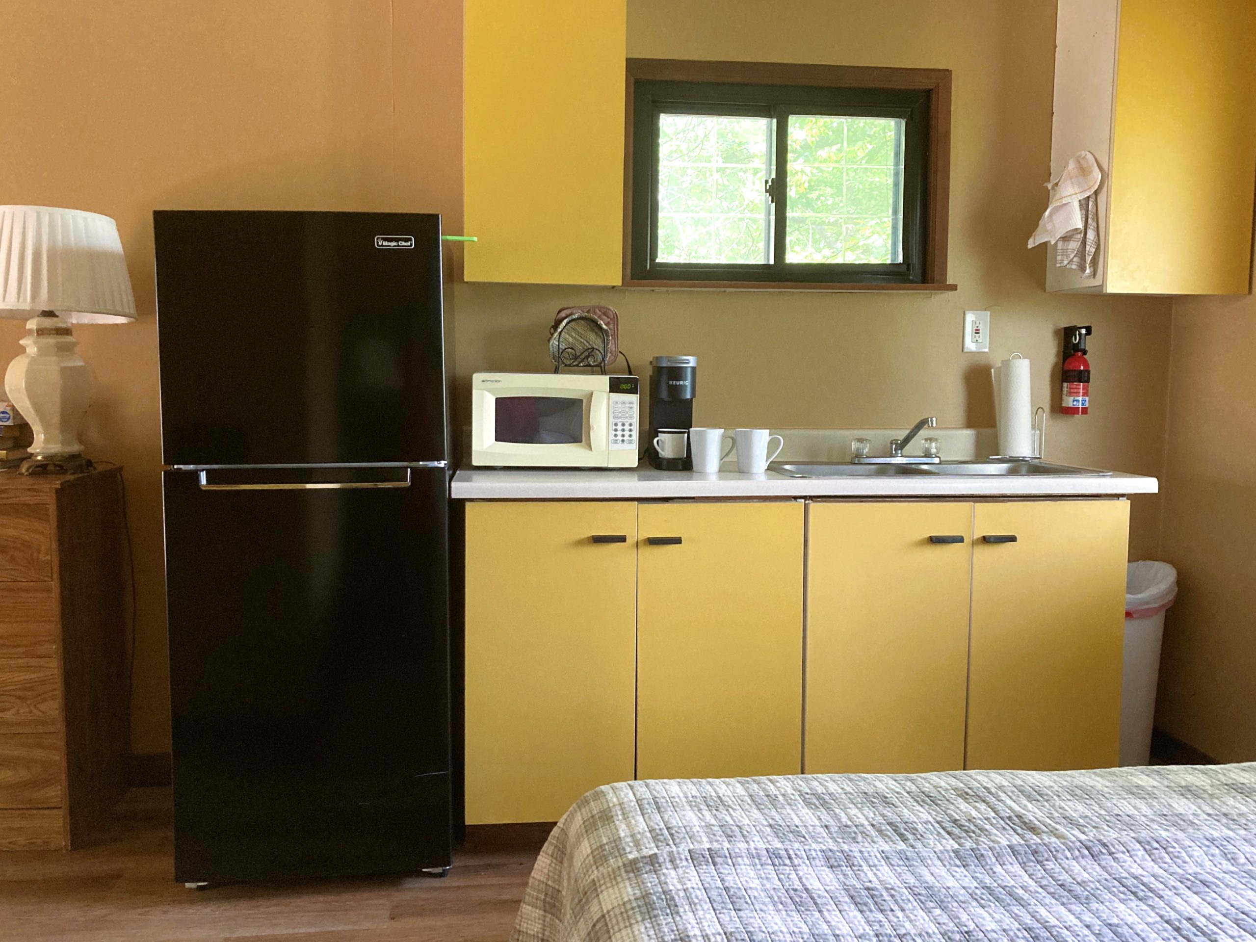- Mini kitchen with fridge, sink, microwave, Keurig coffee maker, toaster (no stove/oven)